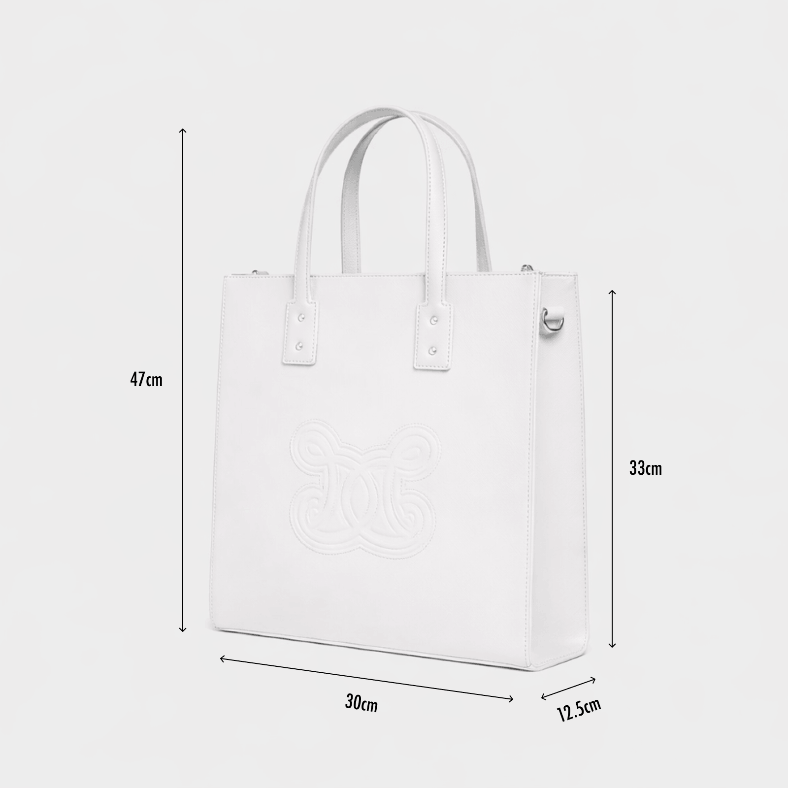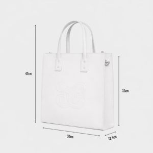 It features an elegant zip closure, double leather handles, and a removable fabric-and-leather shoulder strap. The embossed logo adds a refined and subtle touch, making it perfect for both everyday use and special occasions.